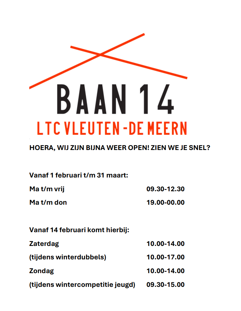 Het is februari, en dus is de kantine van Baan 14 weer open. De komende tijd is Baan 14 op de volgende tijden open:
